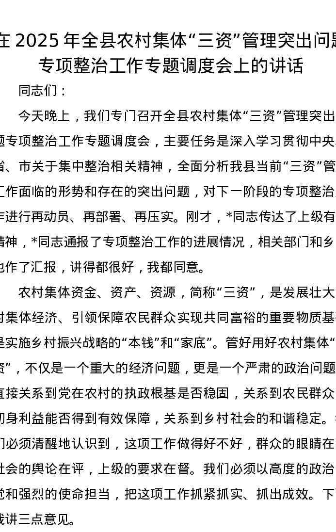 在2025年全县农村集体“三资”管理突出问题专项整治工作专题调度会上的讲话