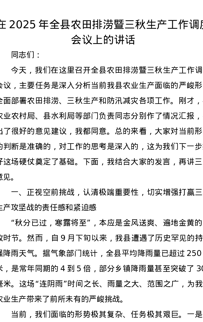 在2025年全县农田排涝暨三秋生产工作调度会议上的讲话