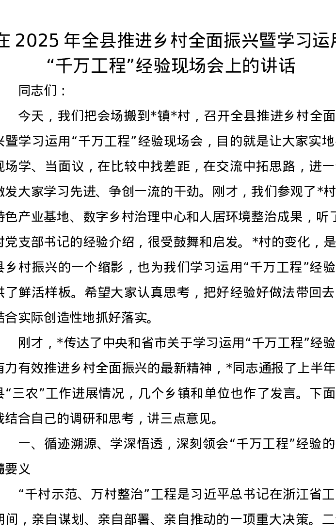 在2025年全县推进乡村全面振兴暨学习运用“千万工程”经验现场会上的讲话
