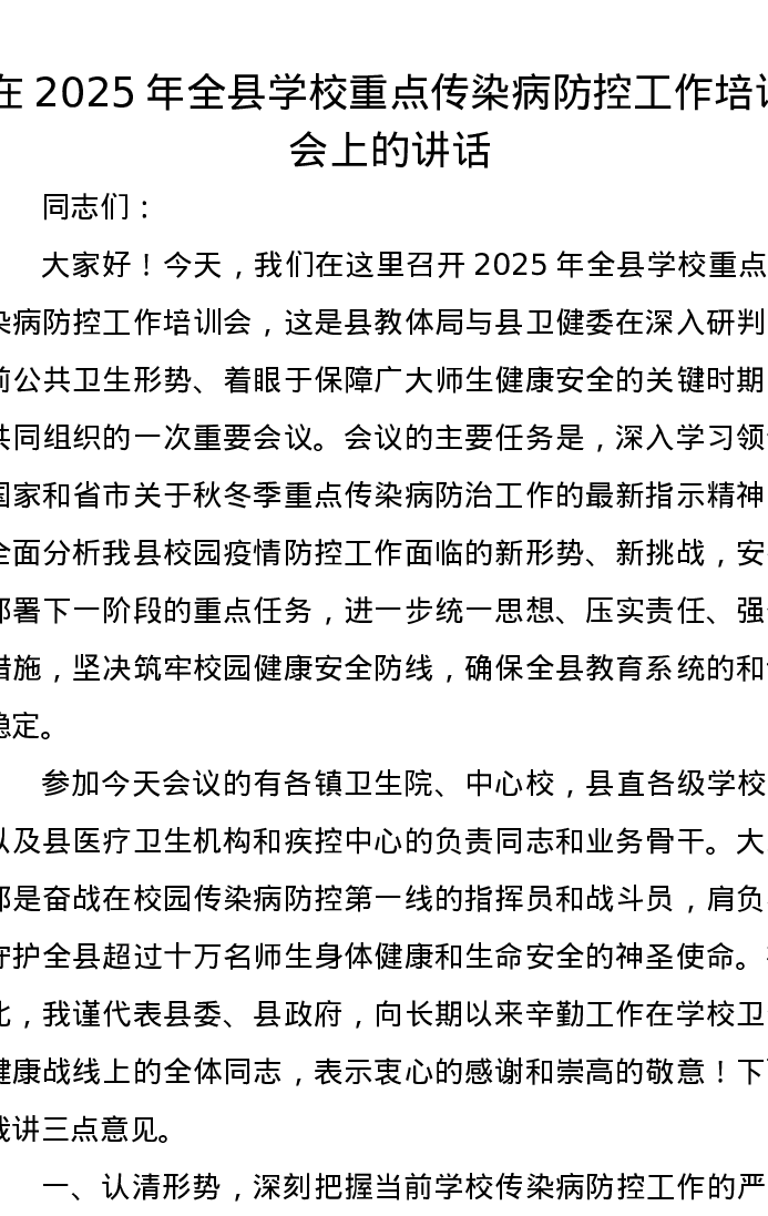 在2025年全县学校重点传染病防控工作培训会上的讲话