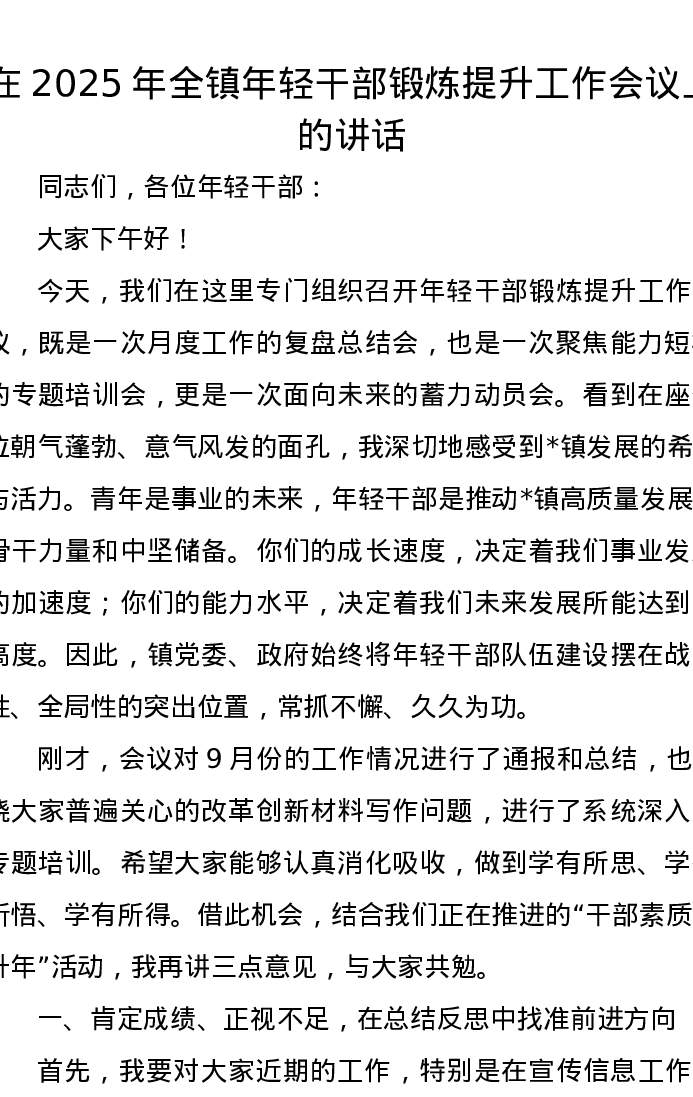 在2025年全镇年轻干部锻炼提升工作会议上的讲话