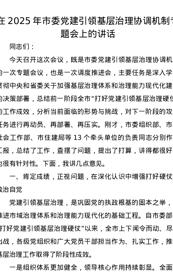在2025年市委党建引领基层治理协调机制专题会上的讲话