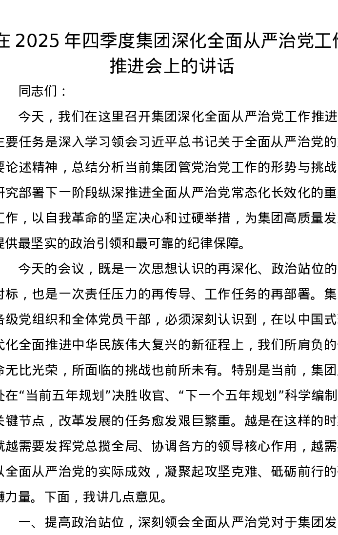 在2025年四季度集团深化全面从严治党工作推进会上的讲话