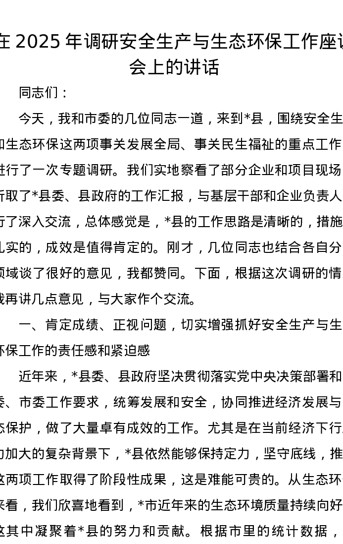 在2025年调研安全生产与生态环保工作座谈会上的讲话