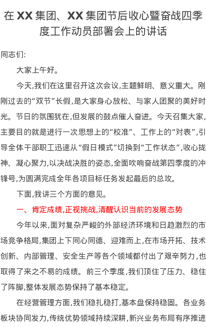 在XX集团、XX集团节后收心暨奋战四季度工作动员部署会上的讲话