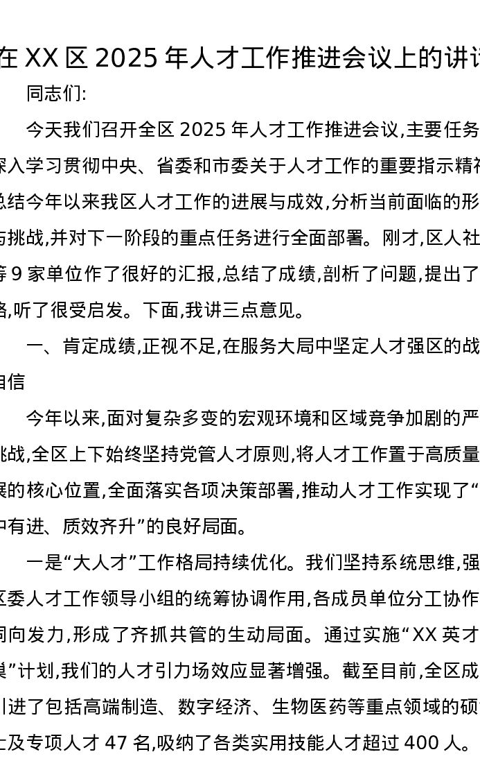 在XX区2025年人才工作推进会议上的讲话