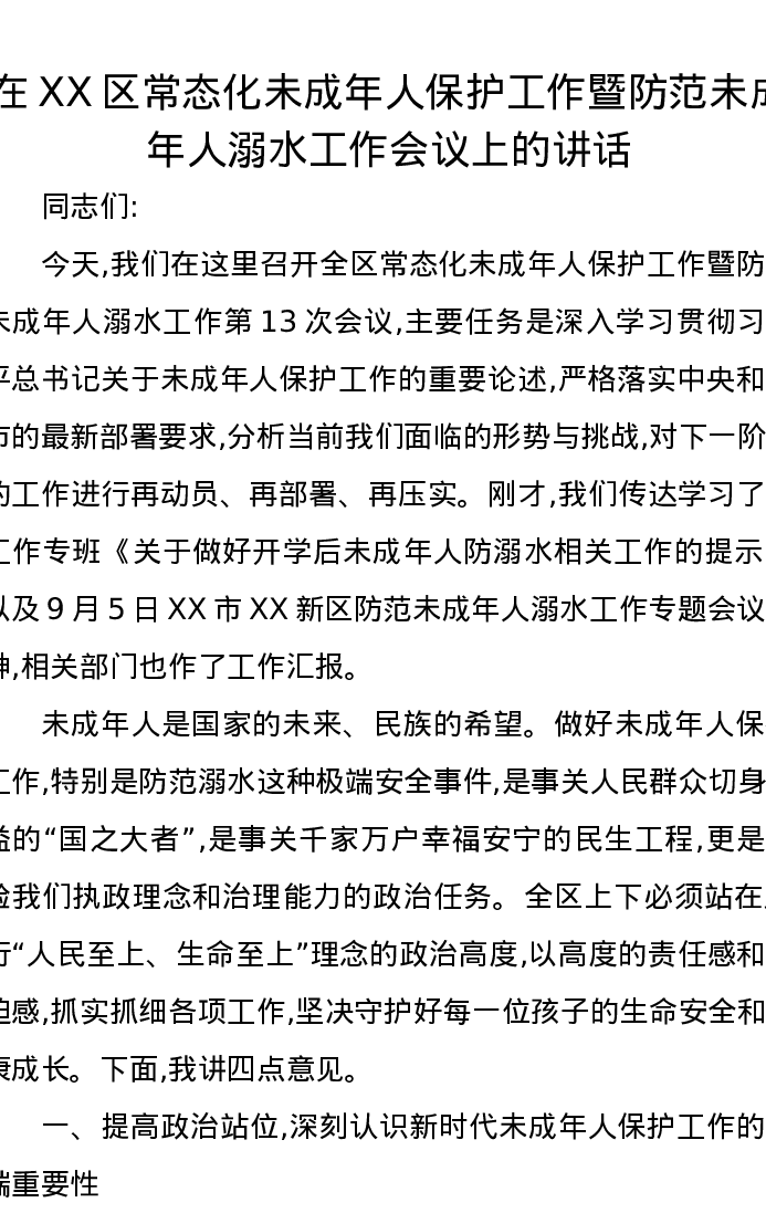 在XX区常态化未成年人保护工作暨防范未成年人溺水工作会议上的讲话2