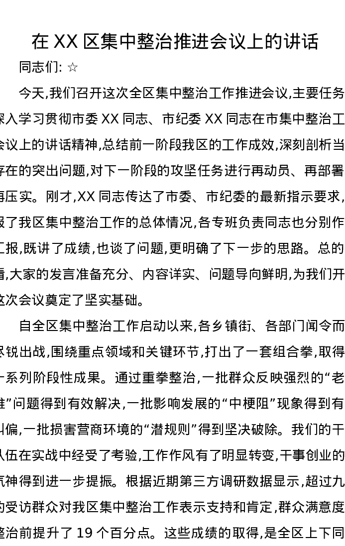 在XX区集中整治推进会议上的讲话