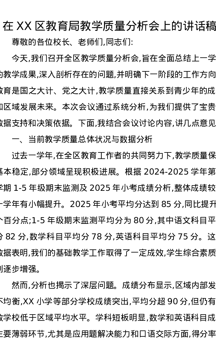 在XX区教育局教学质量分析会上的讲话稿
