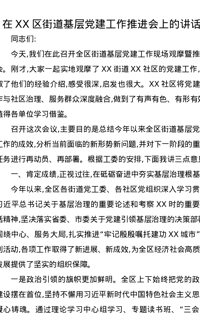 在XX区街道基层党建工作推进会上的讲话