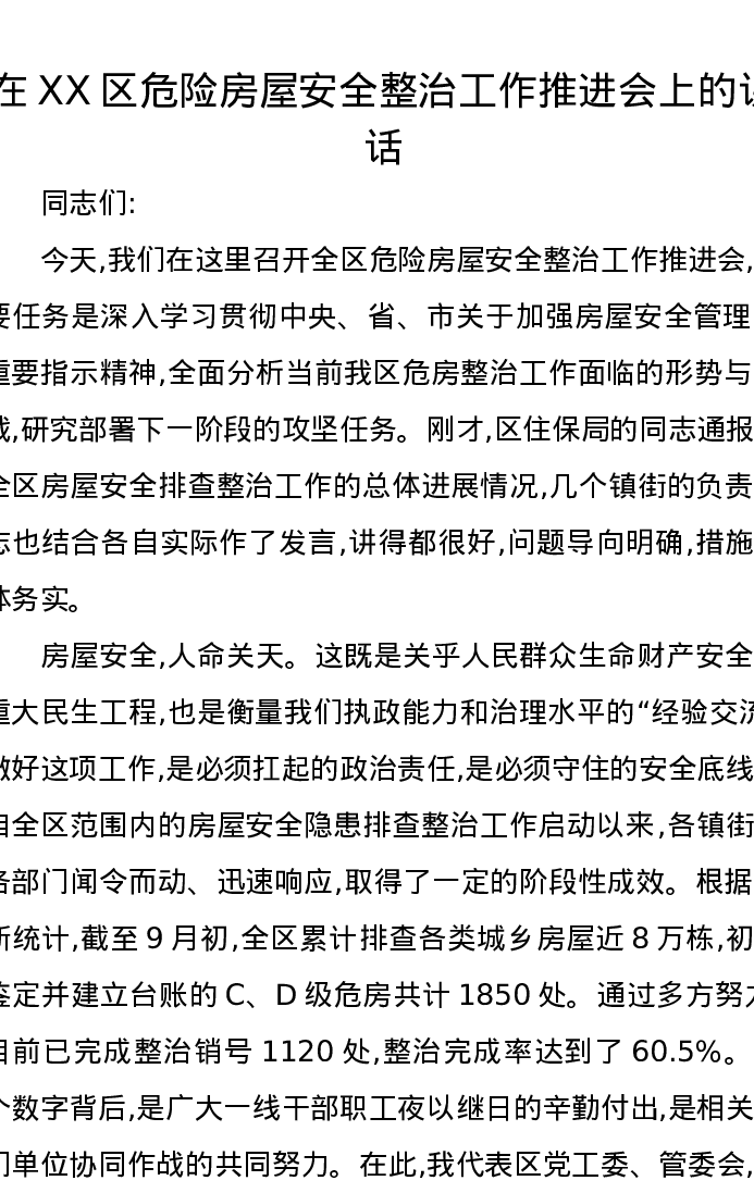 在XX区危险房屋安全整治工作推进会上的讲话