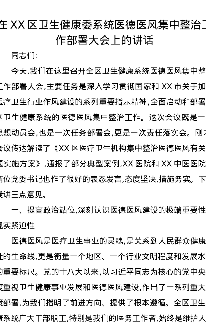 在XX区卫生健康委系统医德医风集中整治工作部署大会上的讲话