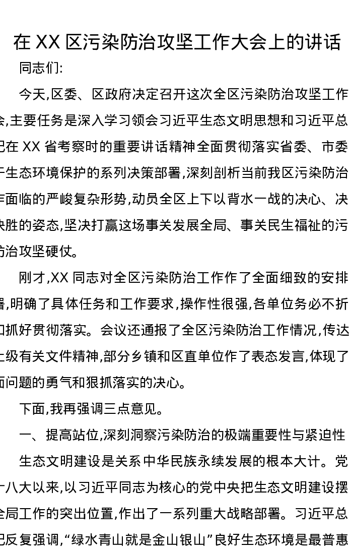 在XX区污染防治攻坚工作大会上的讲话