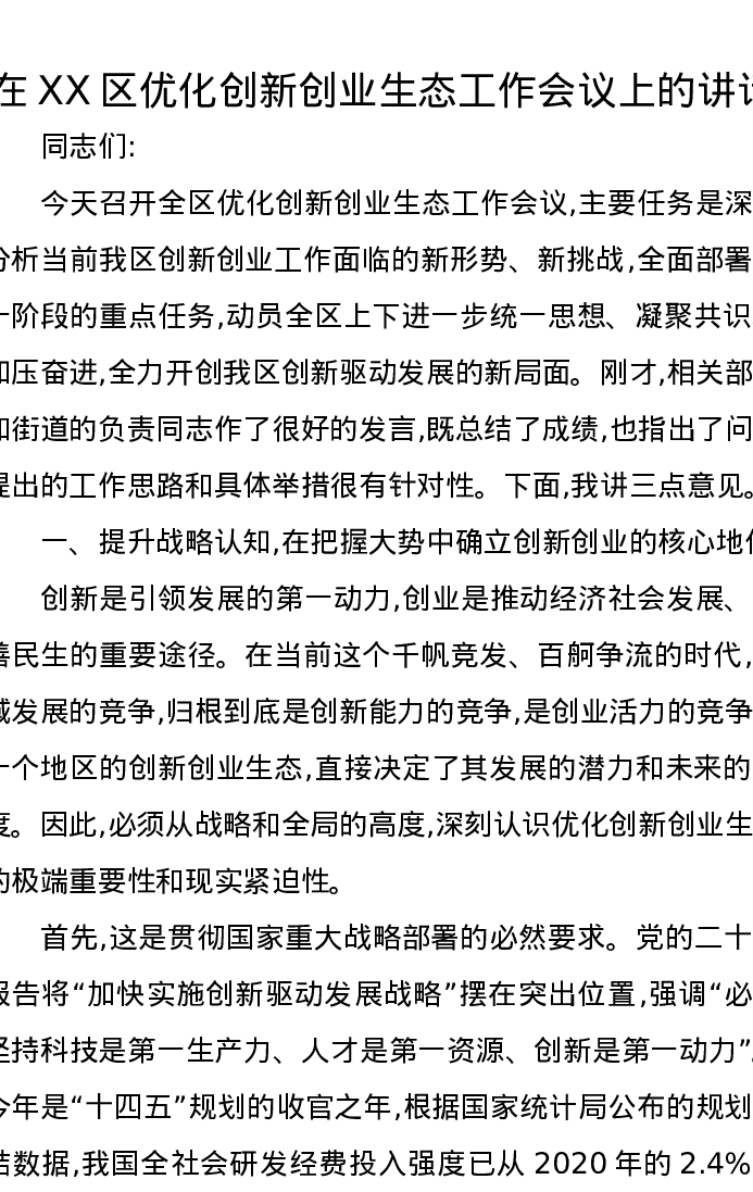 在XX区优化创新创业生态工作会议上的讲话