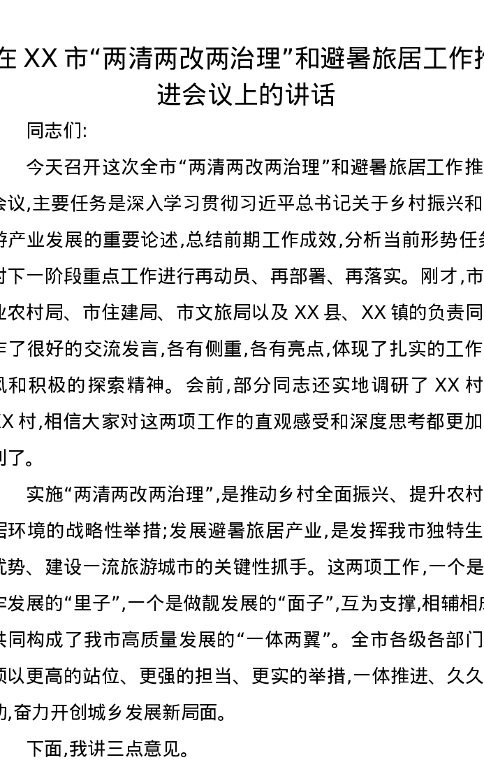 在XX市“两清两改两治理”和避暑旅居工作推进会议上的讲话