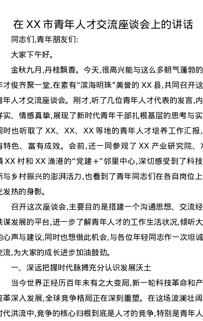 在XX市青年人才交流座谈会上的讲话