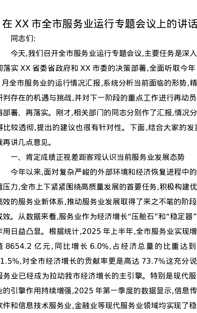 在XX市全市服务业运行专题会议上的讲话