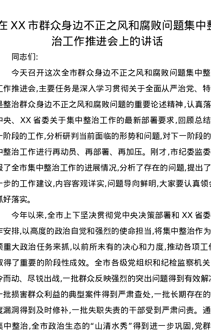 在XX市群众身边不正之风和腐败问题集中整治工作推进会上的讲话3