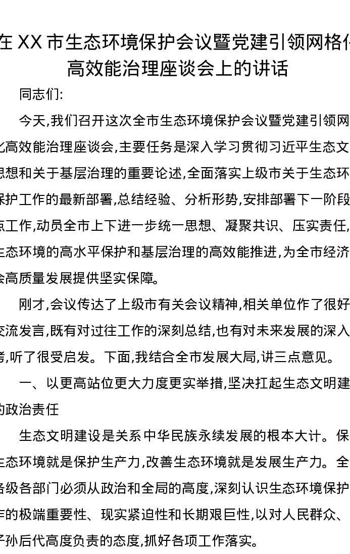 在XX市生态环境保护会议暨党建引领网格化高效能治理座谈会上的讲话