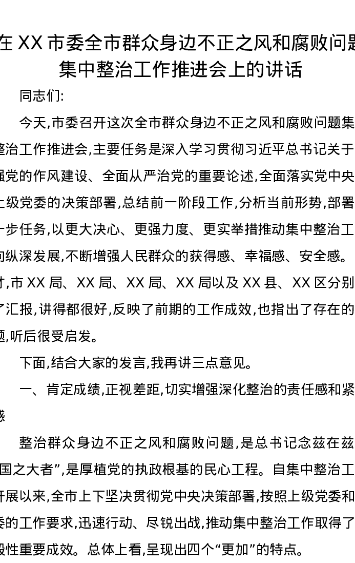 在XX市委全市群众身边不正之风和腐败问题集中整治工作推进会上的讲话2