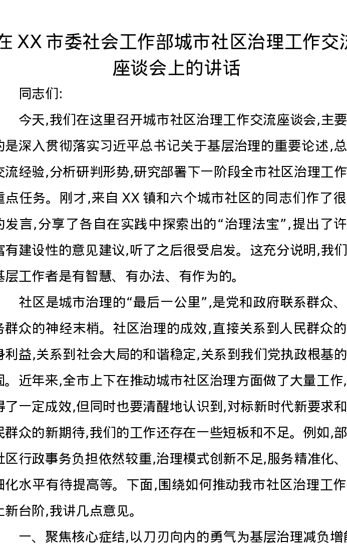 在XX市委社会工作部城市社区治理工作交流座谈会上的讲话