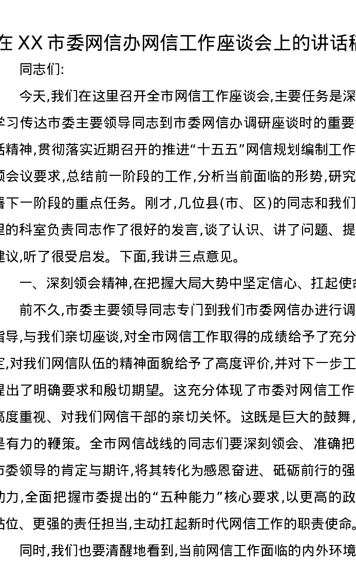 在XX市委网信办网信工作座谈会上的讲话稿
