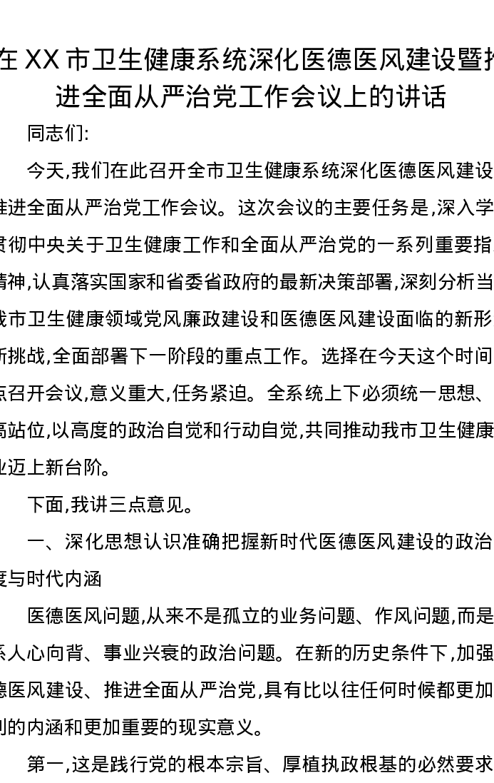 在XX市卫生健康系统深化医德医风建设暨推进全面从严治党工作会议上的讲话