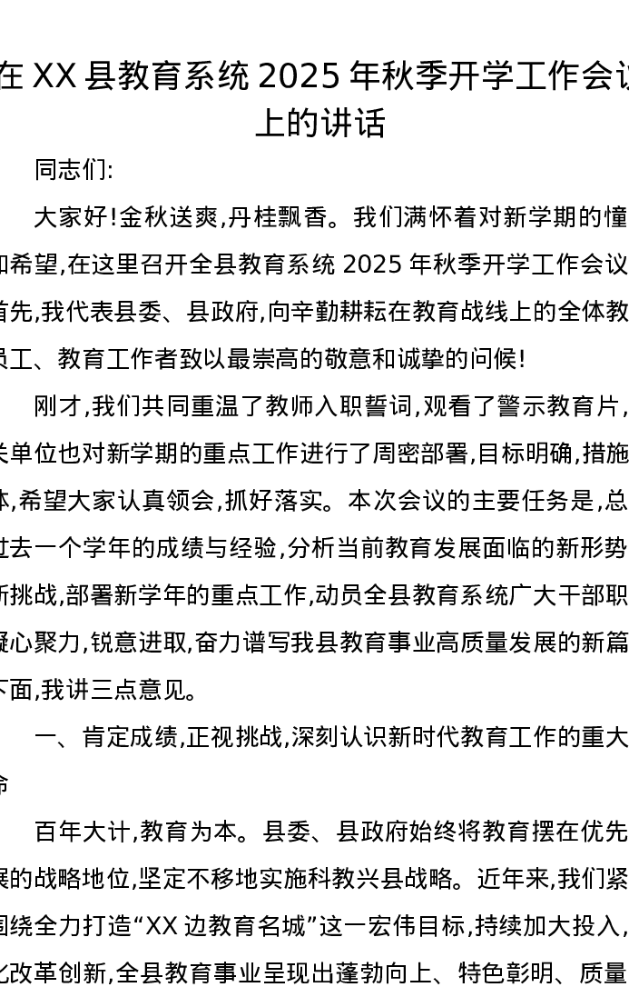 在XX县教育系统2025年秋季开学工作会议上的讲话