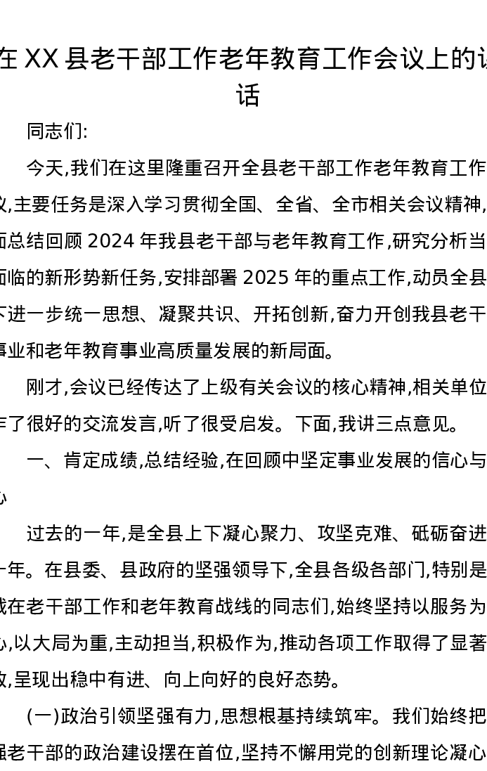 在XX县老干部工作老年教育工作会议上的讲话