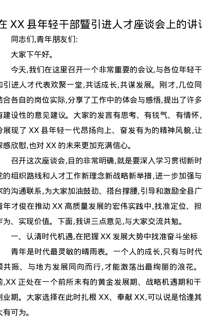 在XX县年轻干部暨引进人才座谈会上的讲话