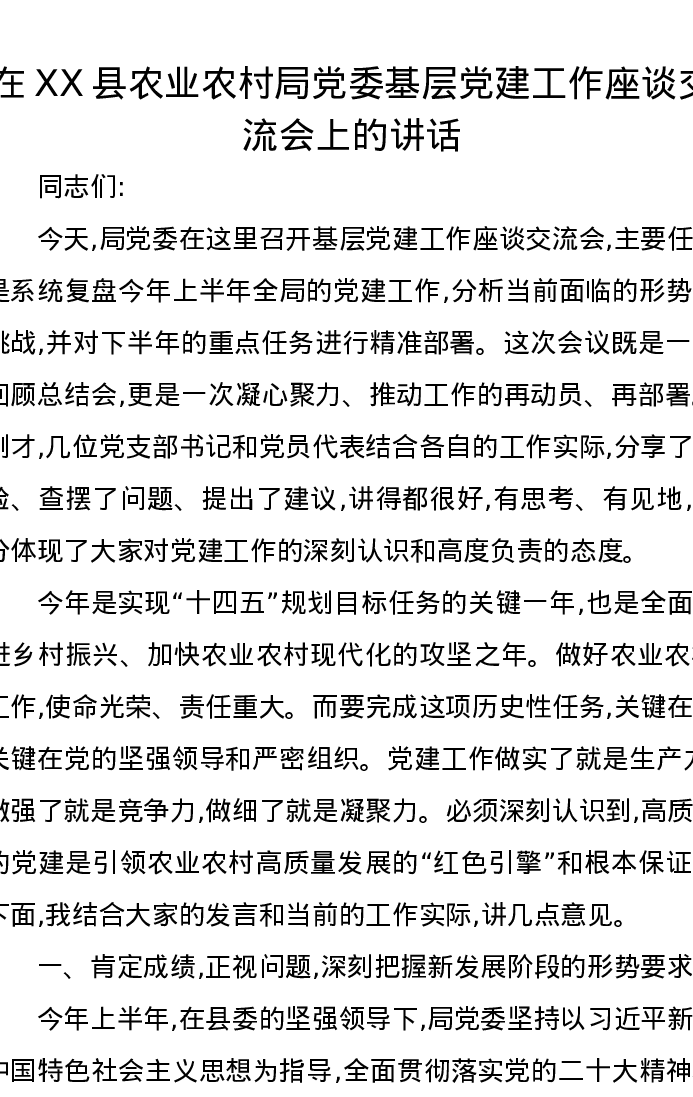 在XX县农业农村局党委基层党建工作座谈交流会上的讲话