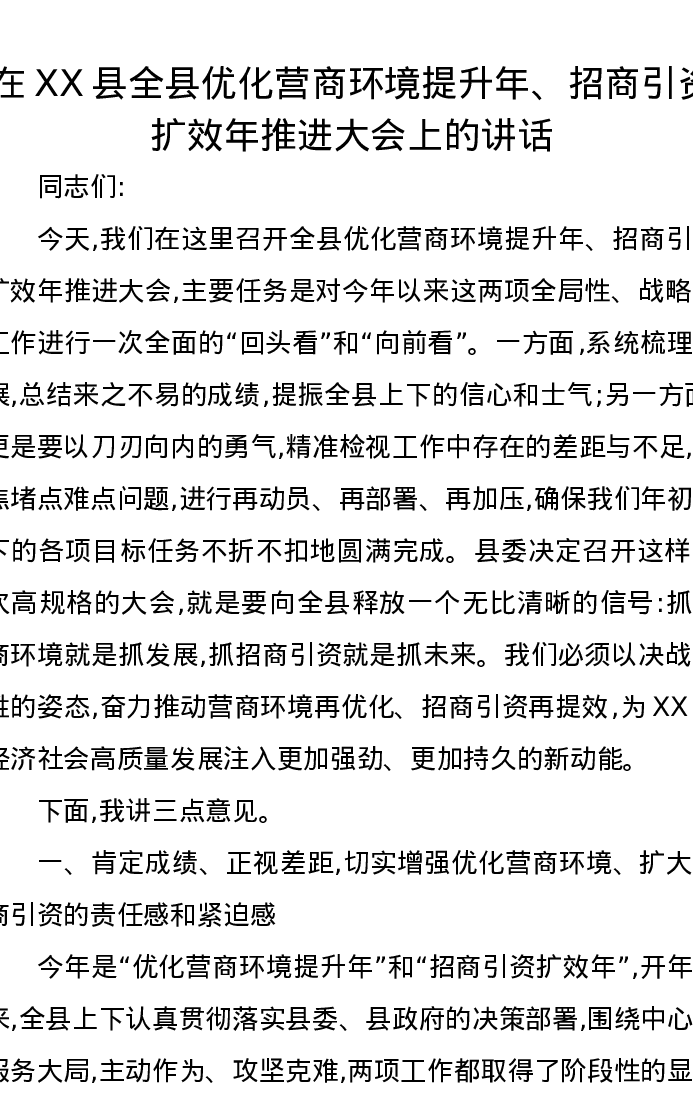 在XX县全县优化营商环境提升年、招商引资扩效年推进大会上的讲话