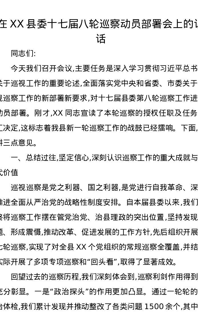 在XX县委十七届八轮巡察动员部署会上的讲话