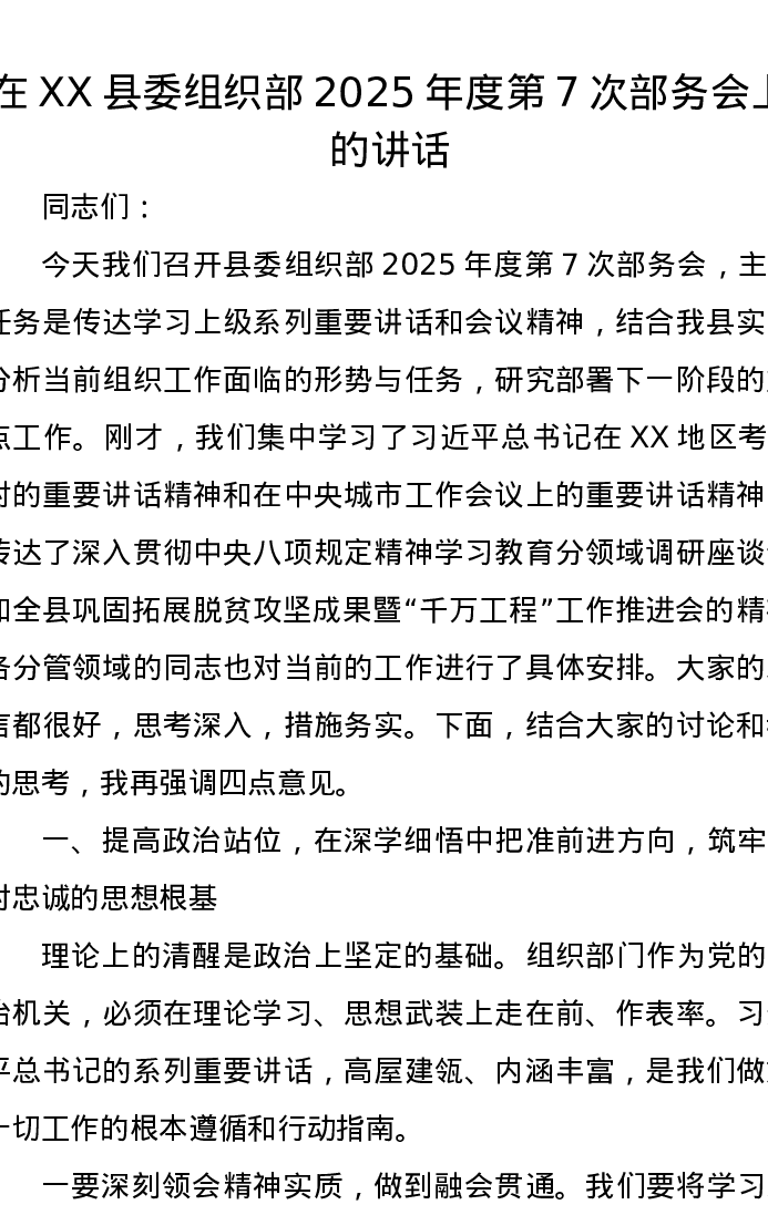 在XX县委组织部2025年度第7次部务会上的讲话