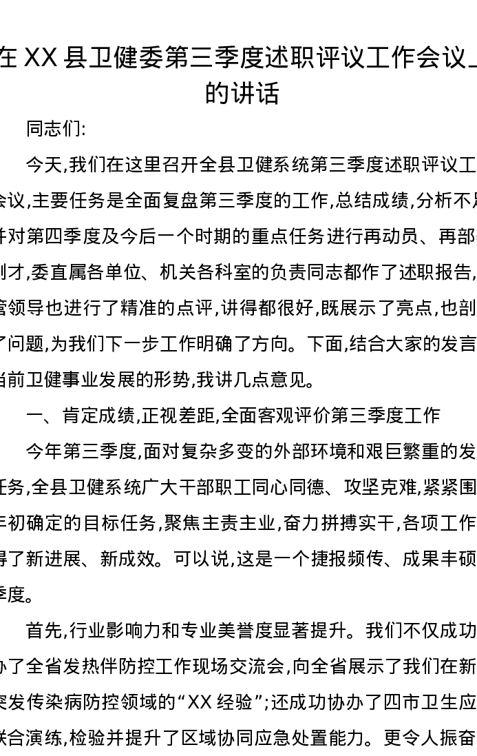 在XX县卫健委第三季度述职评议工作会议上的讲话