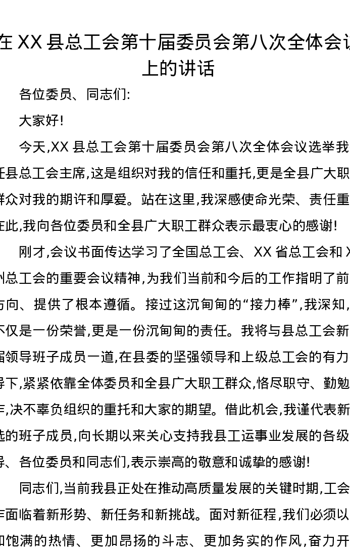 在XX县总工会第十届委员会第八次全体会议上的讲话