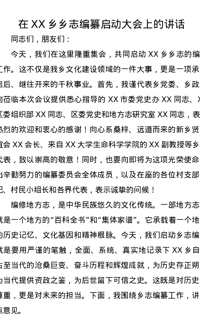 在XX乡乡志编纂启动大会上的讲话