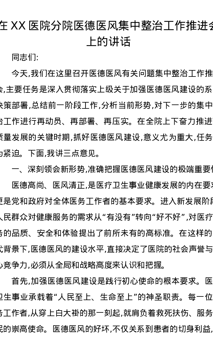 在XX医院分院医德医风集中整治工作推进会上的讲话