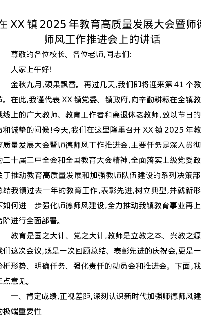 在XX镇2025年教育高质量发展大会暨师德师风工作推进会上的讲话