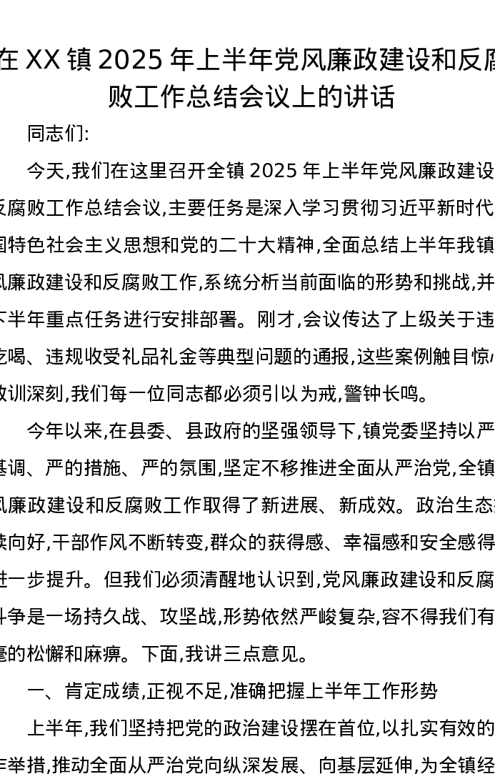 在XX镇2025年上半年党风廉政建设和反腐败工作总结会议上的讲话