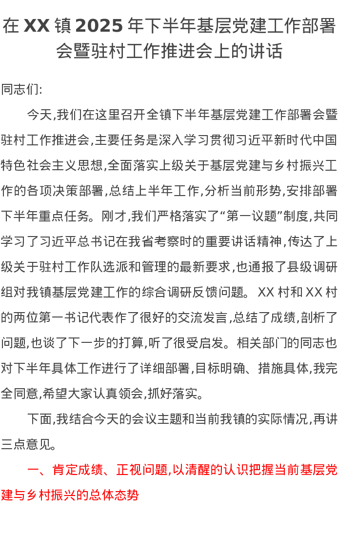 在XX镇2025年下半年基层党建工作部署会暨驻村工作推进会上的讲话