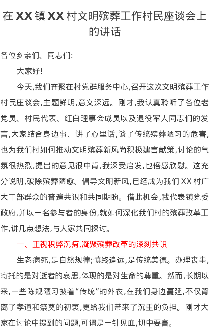 在XX镇XX村文明殡葬工作村民座谈会上的讲话