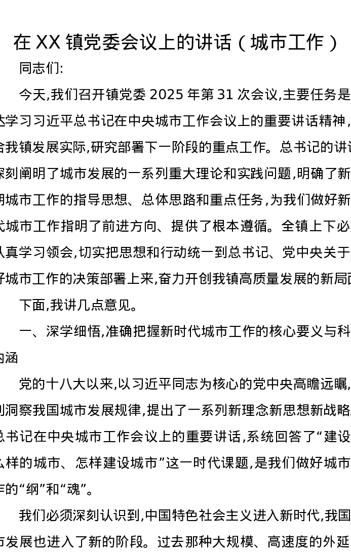 在XX镇党委会议上的讲话(城市工作)