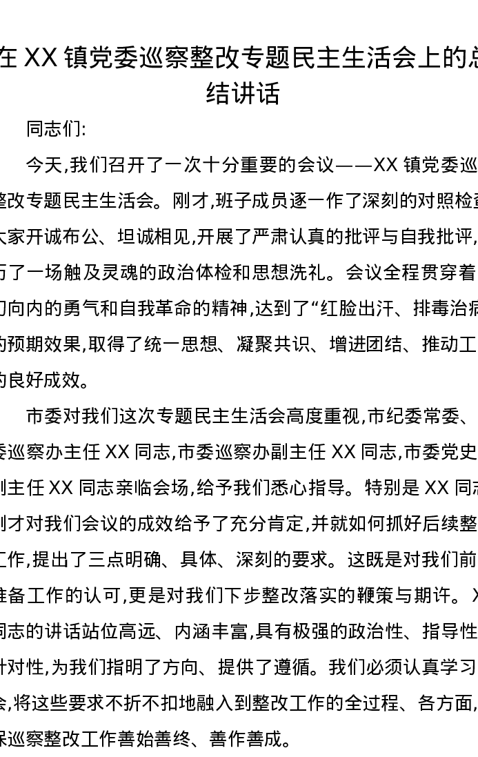 在XX镇党委巡察整改专题民主生活会上的总结讲话