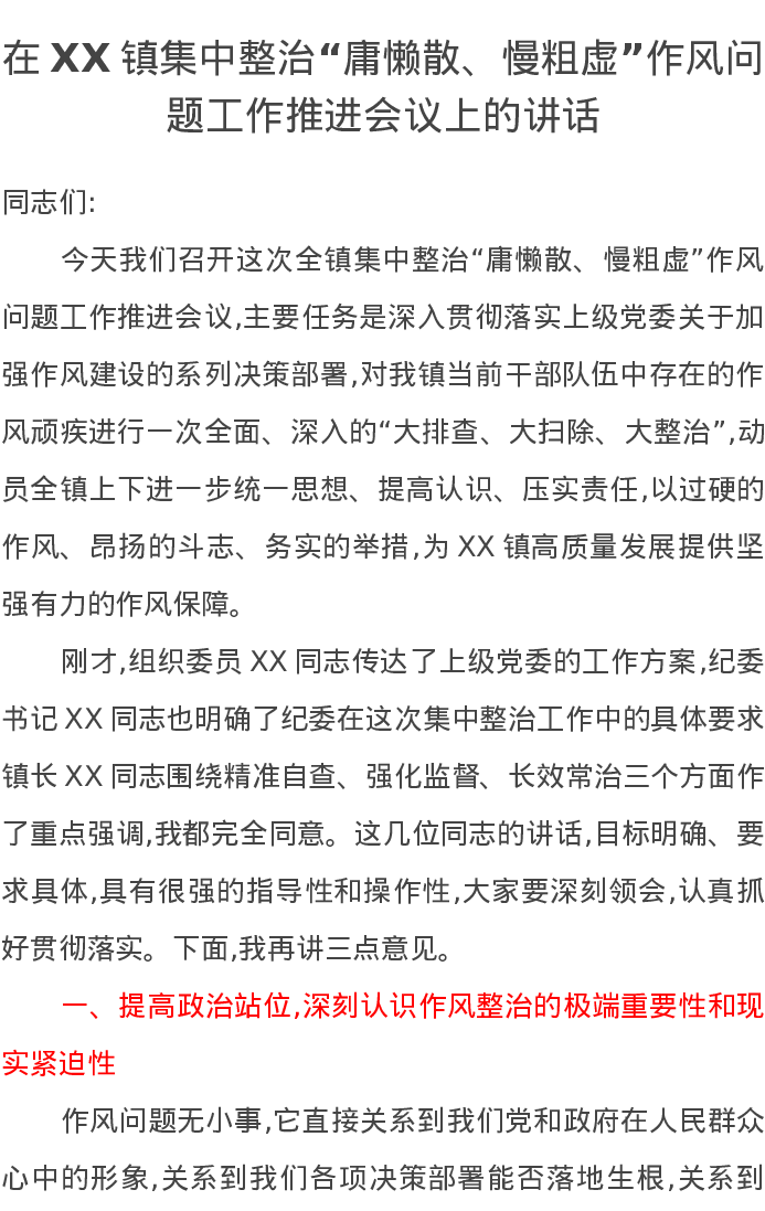 在XX镇集中整治“庸懒散、慢粗虚”作风问题工作推进会议上的讲话