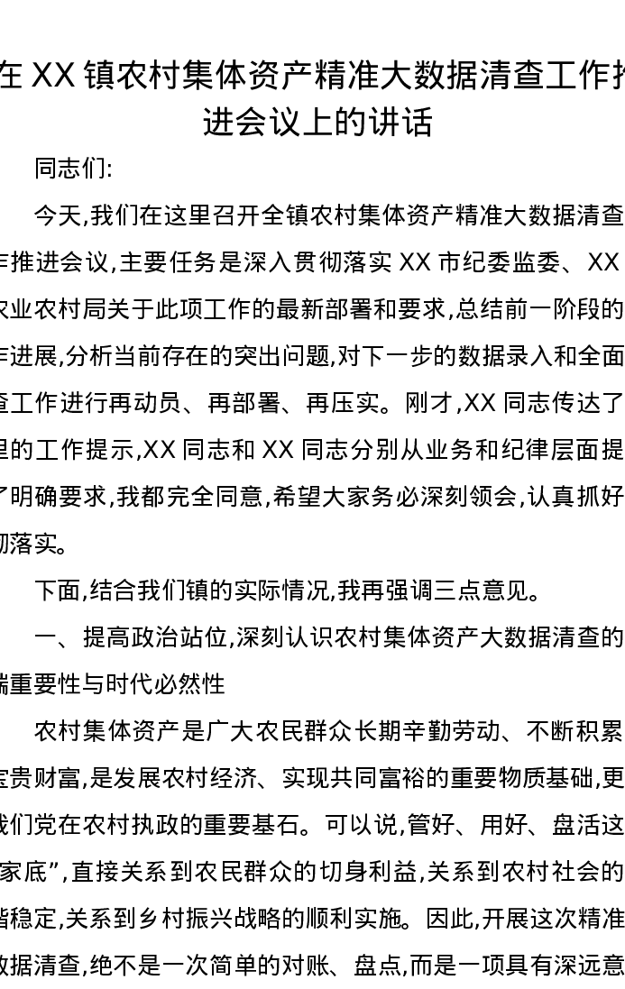 在XX镇农村集体资产精准大数据清查工作推进会议上的讲话