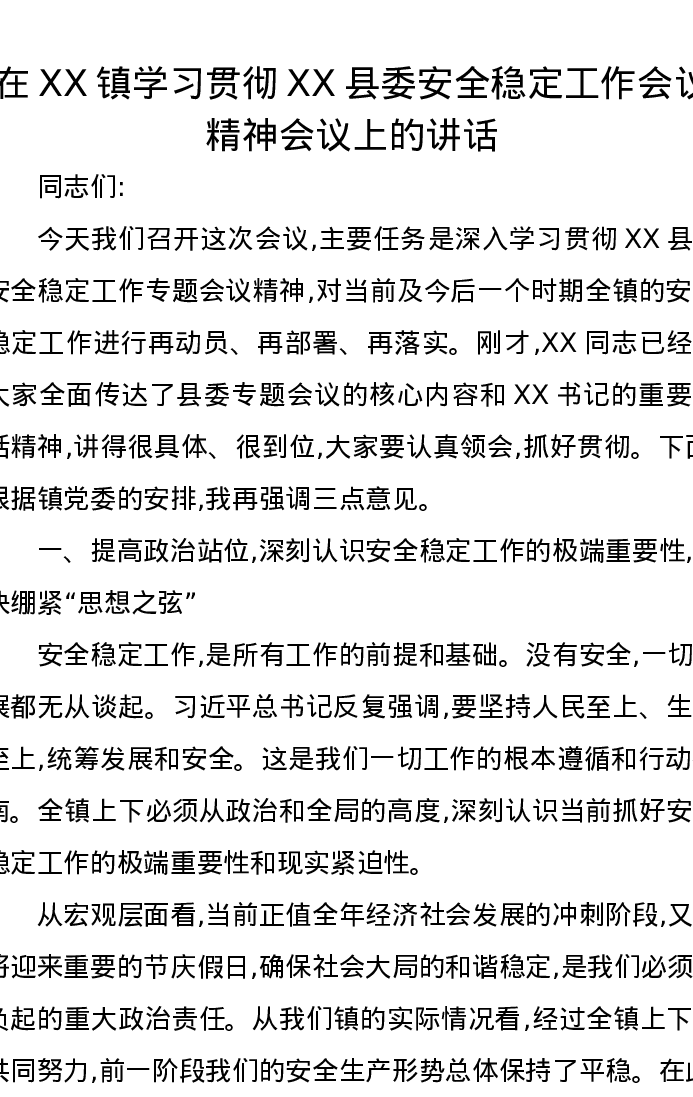 在XX镇学习贯彻XX县委安全稳定工作会议精神会议上的讲话