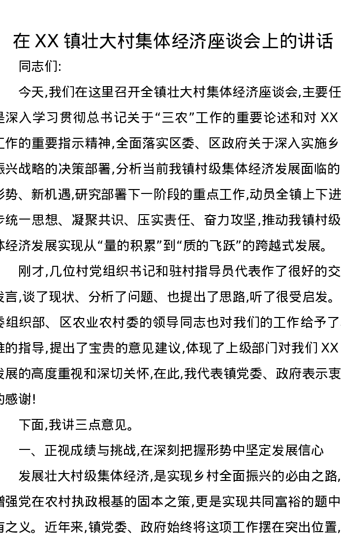在XX镇壮大村集体经济座谈会上的讲话