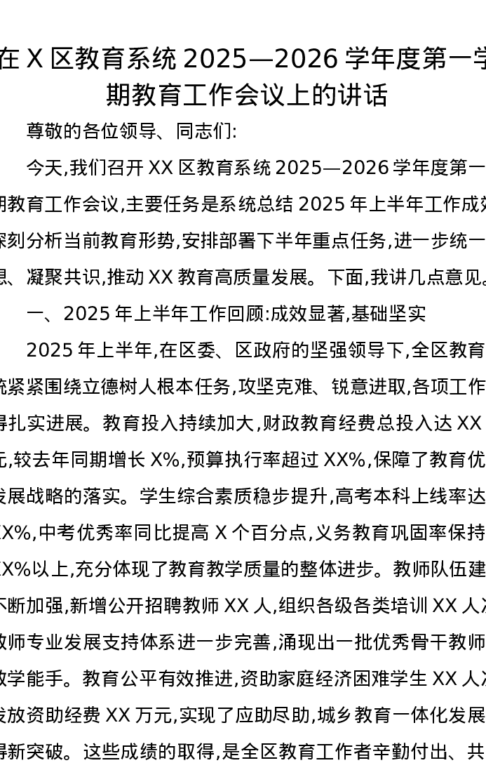 在X区教育系统2025—2026学年度第一学期教育工作会议上的讲话