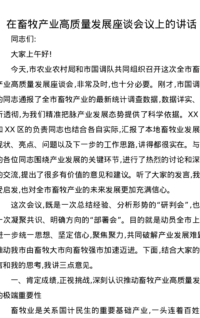 在畜牧产业高质量发展座谈会议上的讲话